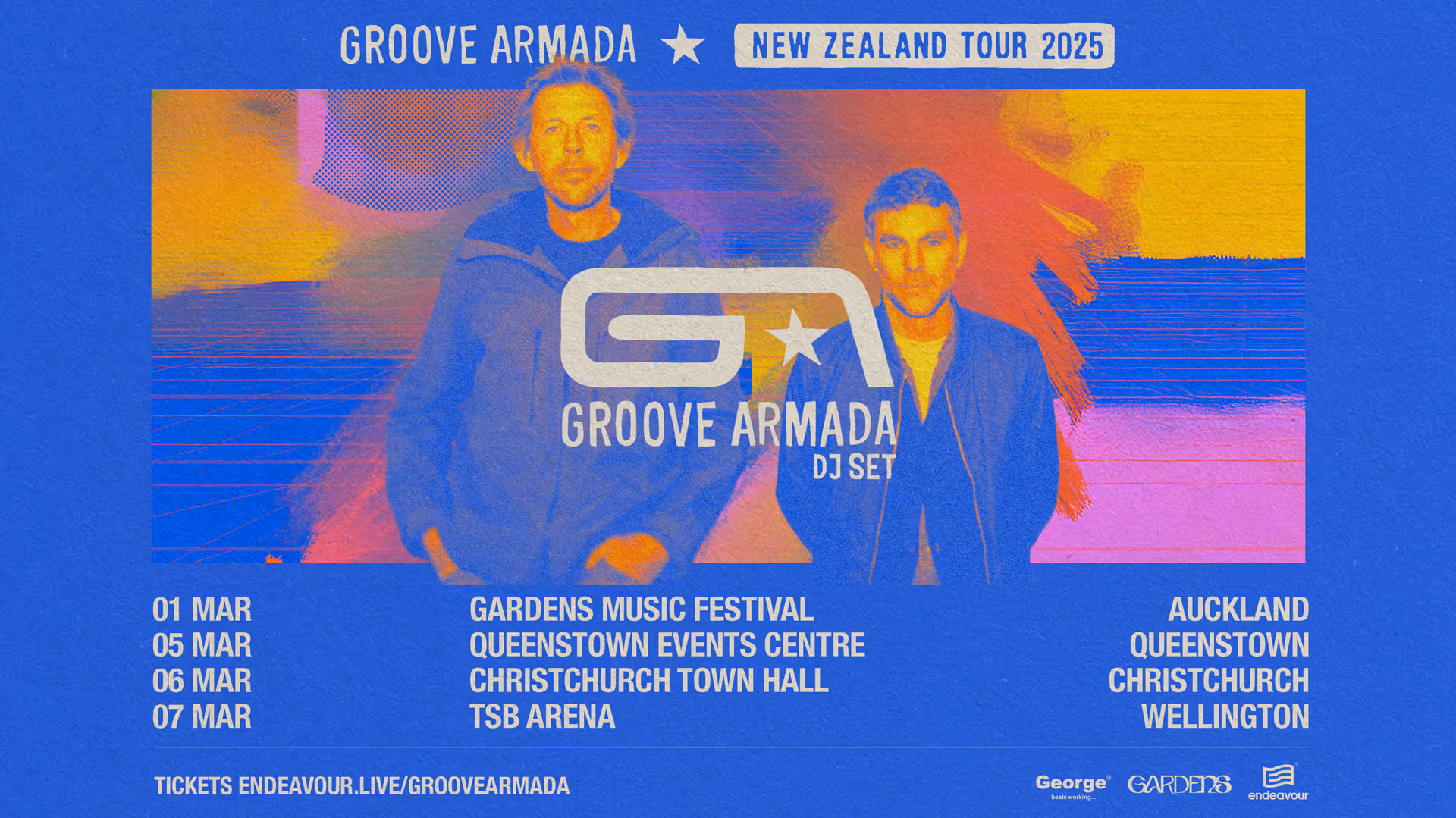 One of the globe's biggest electronic dance acts GROOVE ARMADA will be returning to New Zealand for a four date tour, with shows at QUEENSTOWN EVENTS CENTRE in QUEENSTOWN on WEDNESDAY, MARCH 5 2025, CHRISTCHURCH TOWN HALL in CHRISTCHURCH on THURSDAY, MARCH 6 2025, and TSB ARENA, WELLINGTON on FRIDAY, MARCH 7 2025. The Auckland performance will see Groove Armada perform alongside 2MANYDJS, ROBIN S, BAG RAIDERS and AROHA, headlining the DAY TWO of GARDENS MUSIC FESTIVAL 2025, at the iconic AUCKLAND DOMAIN on SATURDAY, MARCH 1 2025.